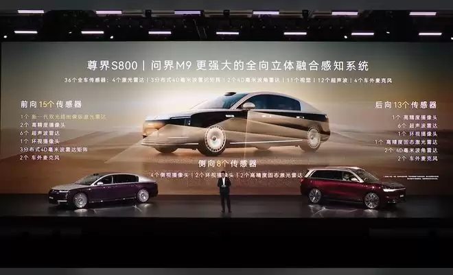 以尊界S800为例,改款车型配备36个高精度辅助驾驶传感器,包含4个激光雷达、3分布式4D毫米波雷达矩阵、2个4D毫米波角雷达、11个视觉摄像头、12个超声波雷达与4个车外麦克风。