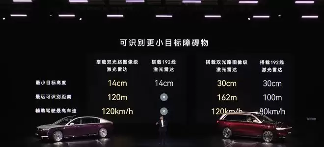 从实际使用出发,该激光雷达也让车辆的主动安全能力得以显著提升。余承东介绍,新一代激光雷达可以在120km/h时识别120m外的14cm小障碍物。