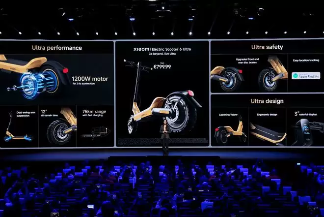 出行领域则是因地制宜地发布了小米电动滑板车6 Ultra,产品定位高性能全地形出行,搭载1200W电机,2.4秒即可完成加速,配备12英寸全地形轮胎与双摇臂悬架,应对复杂路况能力提升;安全方面升级前后碟刹,制动时间缩短17%,还支持Apple Find My定位追踪。此外,该滑板车拥有75km续航并支持快充,搭配3英寸彩色显示屏与人体工学设计,兼顾实用性与体验感。