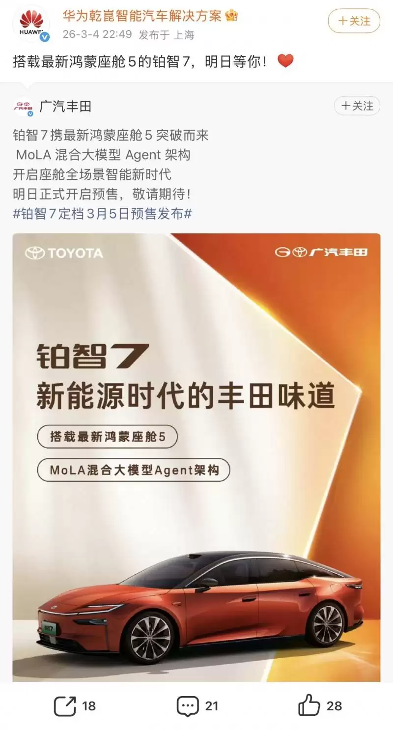 广汽丰田旗下全新纯电车型铂智7将于3月5日15:00正式启动预售。这款产品融合了头部科技企业的技术优势与传统大厂的制造实力,被业内视为合资品牌在智电赛道上的重要突破。通过搭载华为鸿蒙座舱5系统与MoLA大模型架构,新车在人机交互、场景适配和生态融合层面实现了显著跃升,标志着合资纯电车型正式向新势力发起全面挑战。