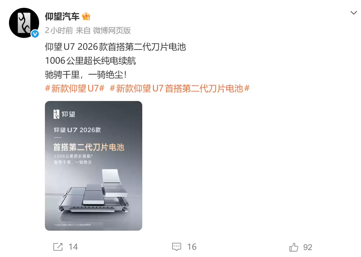 仰望U7将首搭第二代刀片电池:续航破千配兆瓦闪充
