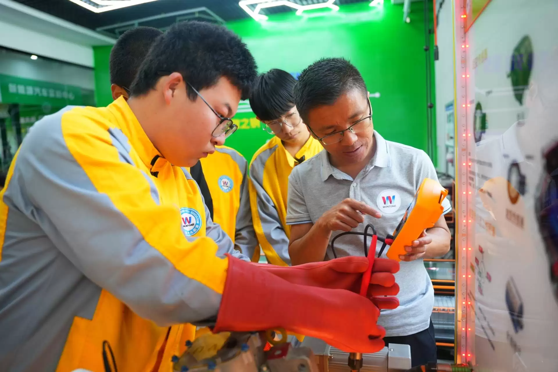 在教学方面,学校坚持理实一体化的教学原则。以新能源汽车检测与维修技术方向为例,课程设计以实践操作为主、理论知识为辅,设置了电池包拆解重组、电控单元编程匹配等众多专项实训项目。而新能源汽车与智能网联工程师方向则融入了企业真实故障案例,让学生在实际的操作场景中掌握核心技术。为了满足全流程的实训需求,学校打造了新能源汽车检测实训中心和智能网联体验区,配备了比亚迪、特斯拉等品牌的实训车辆,以及高压安全实训台、智能驾驶模拟系统等先进教学设备,总价值超过5000万元,真正实现了教室即车间的理想教学场景。