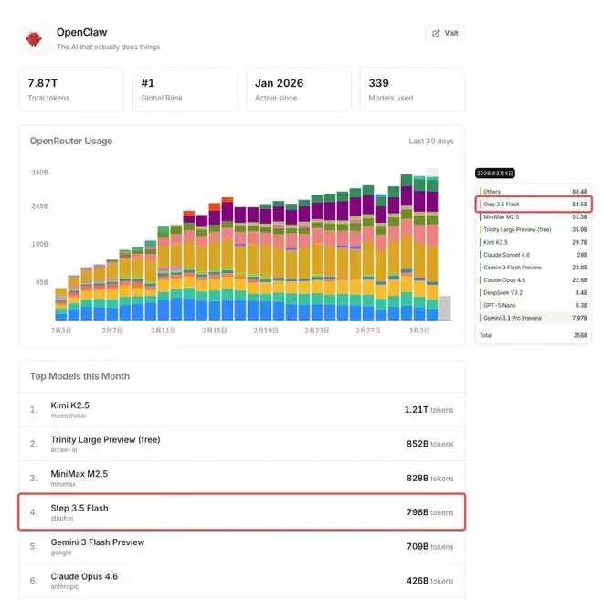 中国大模型占据OpenClaw过半份额,Step 3.5 Flash调用量全球第一