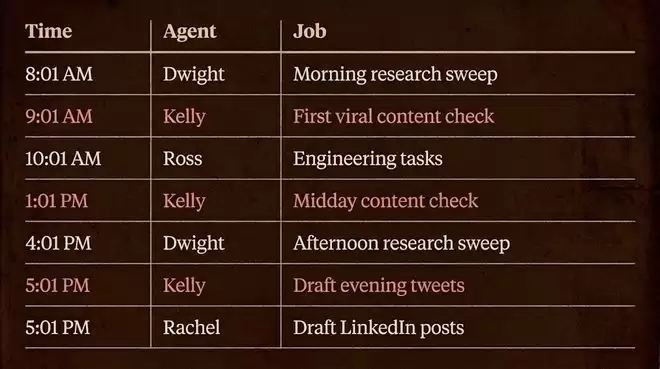 这六个AI智能体不是Saboo手动叫醒的,而是按各自的时间表自动触发。其顺序是:情报员Dwight最先运行,因为其他所有人都要读他的报告。推文写手Kelly和领英写手Rachel在Dwight之后运行,因为他们需要情报文件已经存在。