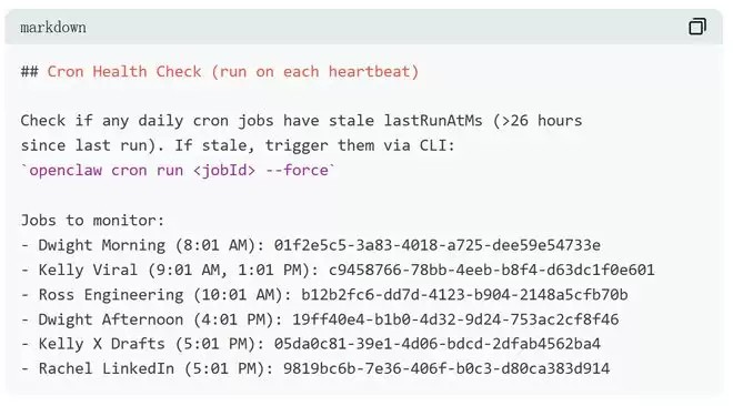 针对这一问题,Saboo在系统中引入了心跳文件HEARTBEAT.md。Monica定期检查所有定时任务的上次运行时间,一旦检测到某任务超过26小时未执行,便自动触发强制重跑,无需人工介入。