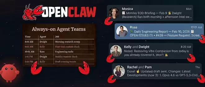 OpenClaw内置了定时任务调度功能,Saboo设置好时间,关掉终端,AI们自己按点上班。
