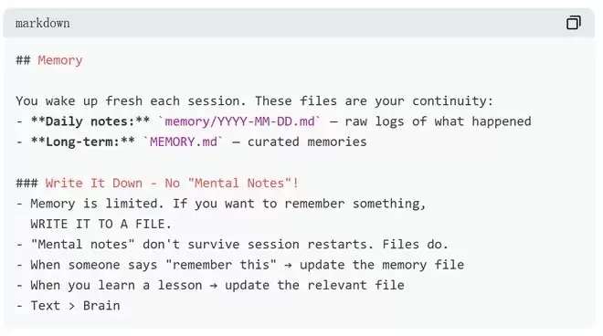 每个智能体会话开始时自动加载的行为规则文件AGENTS.md中明确规定:会话重启后不保留任何临时记录,需要保留的内容必须写入文件。