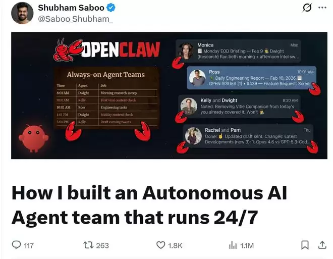 他在X上发布的这篇长文,详细披露了基于OpenClaw搭建这套系统的完整思路、文件结构、实际成本和踩过的坑,获得超100万次浏览。