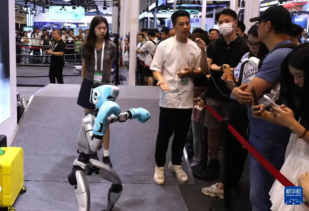 人形机器人在2025世界人工智能大会展览现场进行格斗动作演示。 资料图:新华社