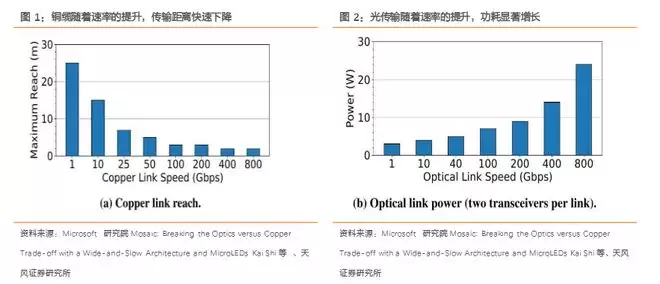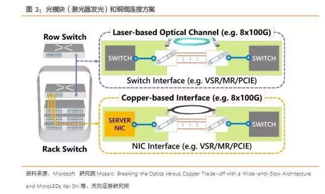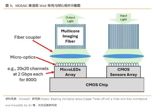 天风证券在报告中引用微软研究团队与微软 Azure推出的MOSAIC方案,提出用Micro LED作为发射器、CMOS传感器作为接收器,采用WaS(wide-and-slow)架构,以大量并行低速通道替代少数高速通道,从而降低对激光器、ADC/DAC、复杂DSP与FEC的依赖。