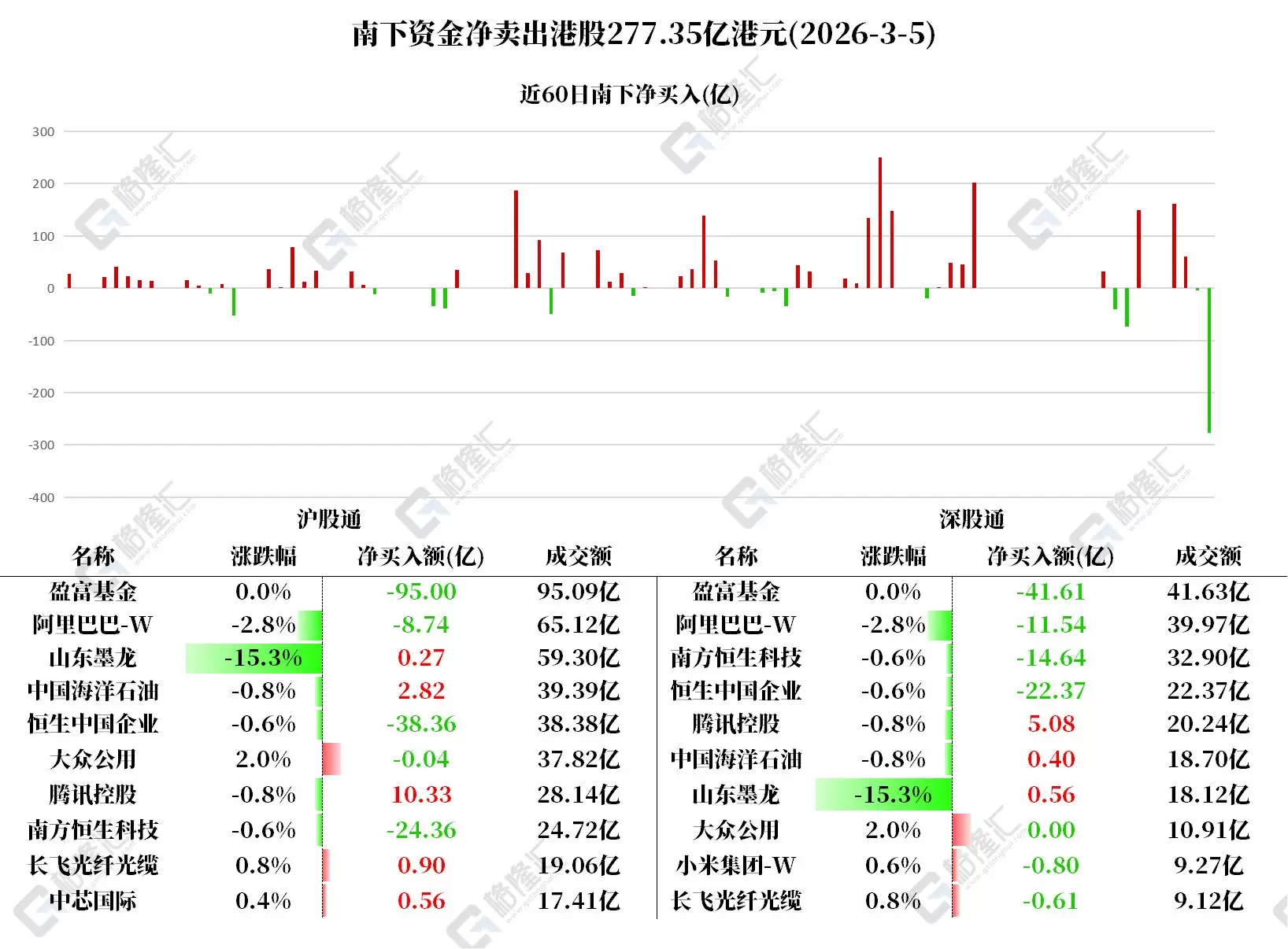 盈富基金遭净卖出136.6亿港元,恒生中国企业遭净卖出60.73亿港元,南方恒生科技遭净卖出39亿港元,阿里巴巴-W遭净卖出20.28亿港元。