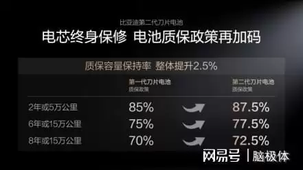 第二代刀片电池通过打造“锂离子高速通道”和“全温域智能热管理系统”,实现了更低的产热和更高效、均匀的散热,让闪充对电池寿命几乎没有影响。基于这样的底气,比亚迪还宣布电池质保政策再加码!第二代刀片电池质保的“容量保持率”整体提升2.5%,电芯依旧是“终身保修”,这就是第二代刀片电池,给所有用户的安心承诺。