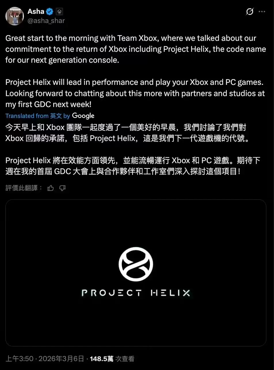3月6日消息,微软Xbox部门新任负责人阿莎·夏尔玛(Asha Sharma)日前在X平台透露,公司内部已在讨论下一代Xbox主机“Project Helix”的开发事宜。