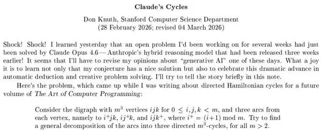 在他近期在斯坦福大学正式上公布的一篇论文《Claude’s Cycles》中,开篇的「Shock! Shock!」非常直白地表达了他对于 AI 强大能力的震惊。