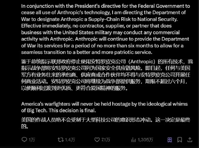 Anthropic的管理层告诉美国国防部,这已经越界了,最终交易告吹。随后,在上周五,美国总统特朗普在社交媒体上宣布封杀Anthropic,美国国防部长Pete Hegseth也于发文称Anthropic构成供应链风险——这种认定通常只会用于美国的对手国家或实体。