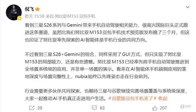 努比亚总裁倪飞指出,“三星S26+Gemini的组合,同样采用了GUI方式,但只实现了努比亚M153的局部能力,还是有些遗憾。努比亚M153已经率先将手机自动驾驶推进到全场景系统级的应用,并非单一场景的演示。行业需要更多伙伴共同探索,也期待三星与谷歌继续完善场景覆盖与系统级深度,大家一起推动AI手机真正走进用户生活。”
