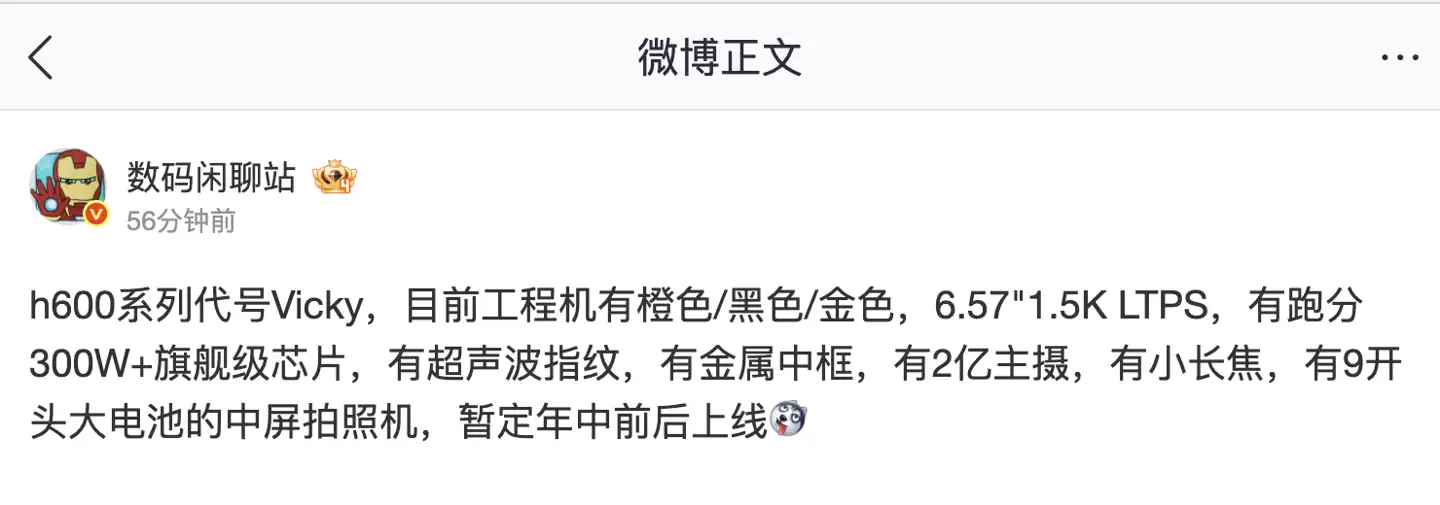3月6日,数码闲聊站博主通过微博曝光了一款内部代号为“Vicky”的H600系列手机新机。