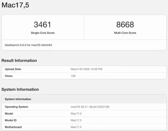 苹果MacBook Neo跑分曝光,单核性能直追M3与M4芯片