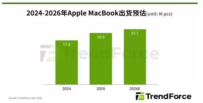 最新行业消息显示,配备A18 Pro芯片的苹果入门级笔记型电脑MacBook Neo有望在2026年引爆市场热度。据调研机构TrendForce预测,其年销量或可达到400万至500万台。受该产品带动,苹果笔记本整体出货量预计将逆势增长7.7%,其macOS系统的市场占有率也将提升至13.2%。