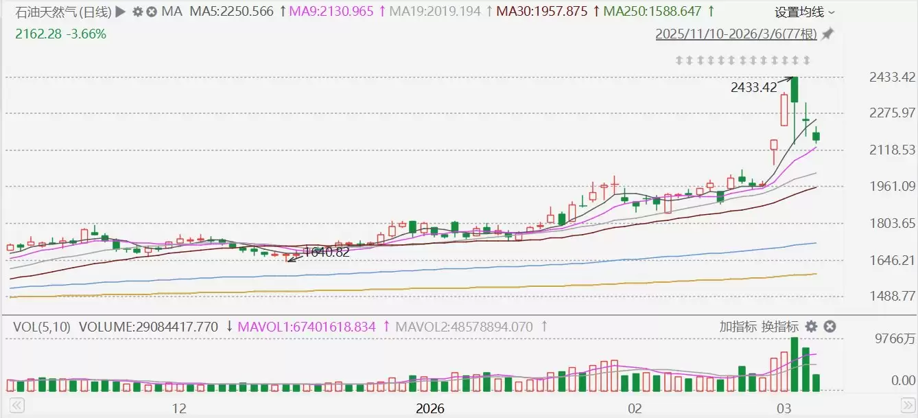 A股市场的石油天然气板块近期走势颇为震荡。受中东局势恶化影响,该板块曾连续两日强势上涨,但好景不长,近日接连回调,今日再度下挫,已是连续第三个交易日走低。