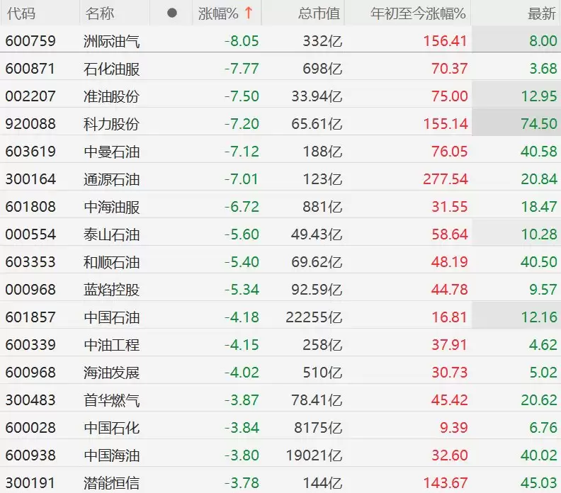 具体来看,洲际油气跌幅达8%,石化油服、准油股份、科力股份、中曼石油、通源石油均跌超7%。中海油服下挫超6%,泰山石油、和顺石油、蓝焰控股跌幅超过5%。中国石油、中油工程、海油发展跌逾4%,首华燃气、中国石化、中国海油跌幅也超过3%。