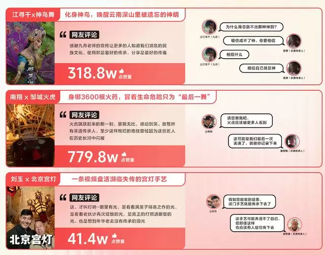 与此同时,越来越多年轻人主动走上传承舞台。报告显示,2025年,抖音上的00后非遗创作者同比增长63%,成为传统文化创新表达的重要力量。一批“文化寻宝人”深入市井乡野,寻找那些濒危的非遗技艺,抖音创作者@江寻千(九月) 化身神鸟,让网友们看见云南深山鲜为人知的民族文化;抖音创作者@南翔 身绑3600根火药,复刻邹城火虎的古老技艺,视频点赞量超700万。