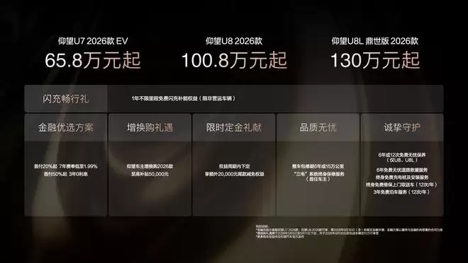 此外,仰望汽车还推出了闪充畅行礼遇,2026年5月11日(含)前支付2026款仰望车型定金的用户,自交付之日起,可享受一年内在比亚迪闪充充电桩免费充电权益(限非营运车主)。