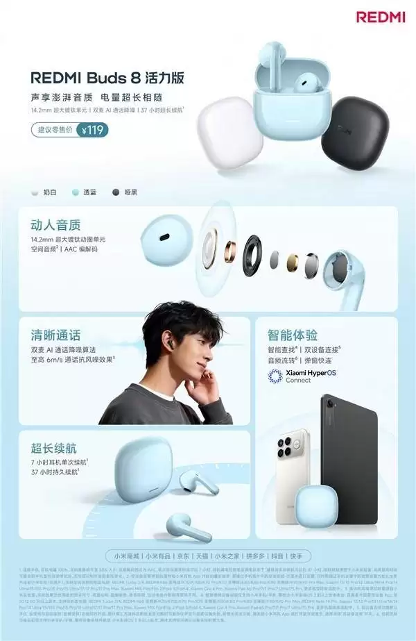 Redmi Buds8活力版开售:119元享双麦降噪与37小时续航