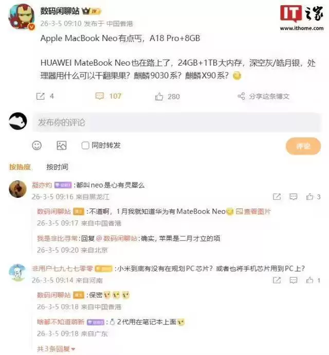 关于核心处理器信息,爆料者并未直接公布具体型号,而是抛出两个可能性选项引发网友讨论——麒麟9030系列或麒麟X90系列。这种悬念式爆料迅速点燃了科技爱好者的讨论热情,相关话题在社交平台持续发酵。值得注意的是,该博主此前曾于1月就提及过华为存在MateBook Neo的研发计划,此次爆料可视为对前期信息的补充确认。