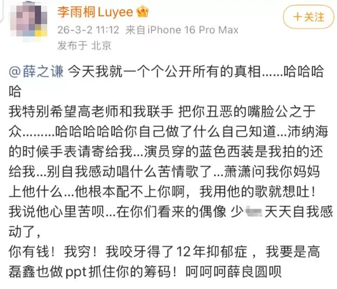 当年高磊鑫怀孕后,李雨桐发过一条微博,说看在孩子的份上放过对方,偃旗息鼓。后来很多年,确实没在公开场合再撕过薛。所以在不明内情的网友看来,这一次的突然爆发是毫无征兆的。