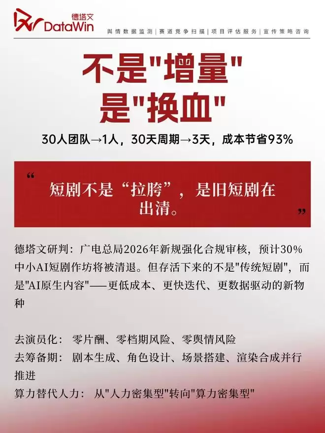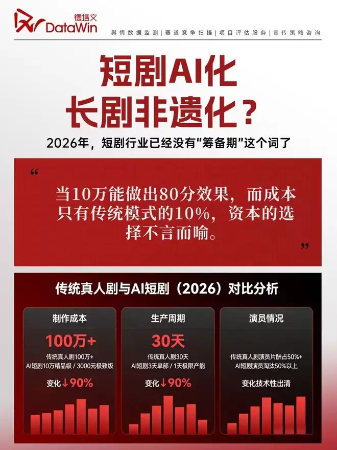 【2026年,内容产业的强制换挡】当AI技术将短剧制作成本从百万级别压缩至十万量级,当演员淘汰率突破50%大关,当"日更十集"从口号变成常态——短剧行业正在全面拥抱AI变革,而长剧制作则被迫走向"非遗化"道路(规模缩减、成本攀升、产能稀缺)。这并非行业微调,而是生产逻辑的彻底重构。
