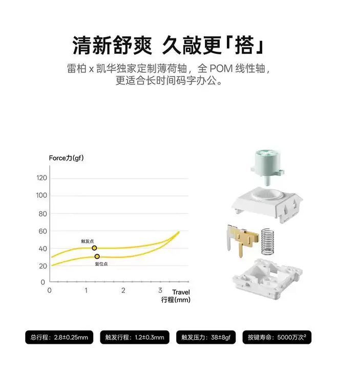 这款键盘搭载凯华定制全POM材质矮轴“薄荷轴”,具备2.8±0.25mm总行程与1.2±0.3mm触发行程,触发压力38±8gf,按键寿命达到5000万次。配套键帽采用PBT材质双色注塑工艺打造。