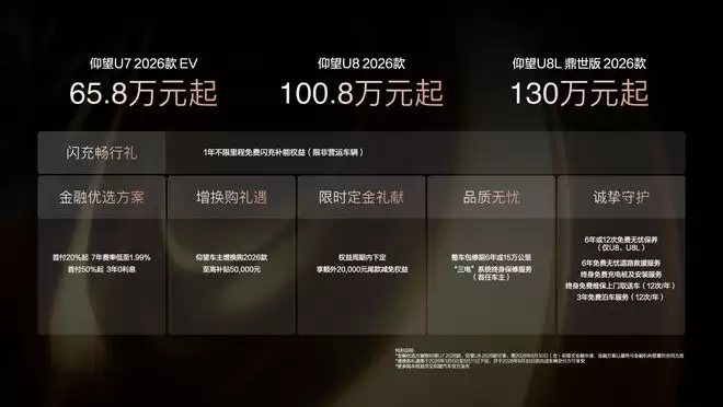 其中,仰望U7售价65.8万元起,U7定位百万级高端新能源轿车,搭载150kWh大容量电池包,CLTC续航可达约1006km。新车还配备先进的智能驾驶辅助系统以及高性能电驱平台,强调豪华舒适与高性能兼顾。