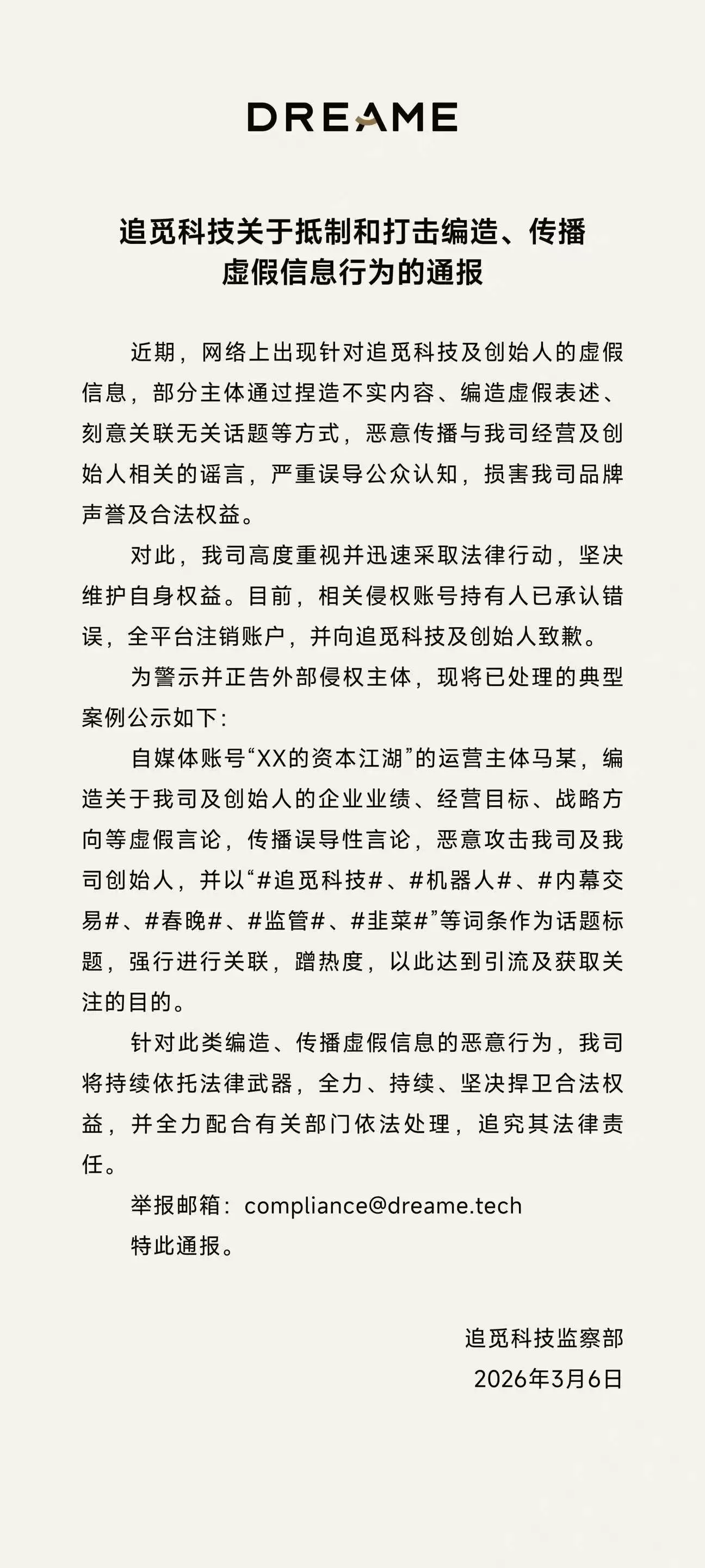 3月6日,追光科技发布公告称,近期网络上出现多起针对追光科技及其创始人的不实信息。部分账号通过捏造虚假内容、关联无关话题等方式恶意传播与公司及创始人相关的谣言,严重误导公众认知,损害了公司品牌声誉与合法权益。