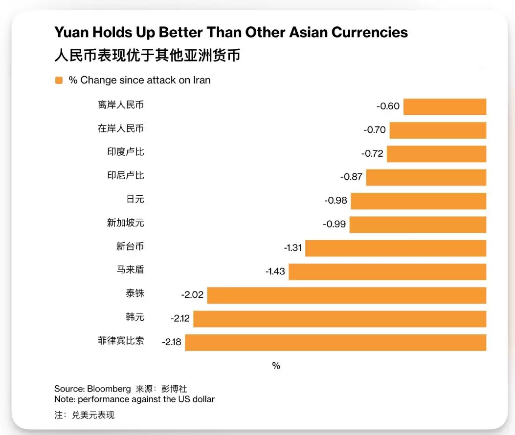 本周,伊朗冲突升级在全球市场引发一波抛售潮。然而,中国市场的表现却展现出了一定的韧性。与亚洲其他主要市场相比,A股和人民币的跌幅相对较小,中国国债也表现出更强的抗压性。