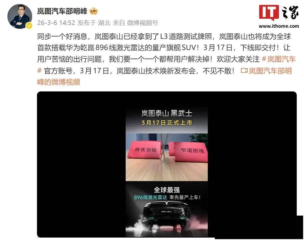 此前,岚图汽车科技股份有限公司董事长卢放也曾宣布,中国首款量产L3级SUV——岚图泰山黑武士将于3月正式上市。这款新车将率先采用华为最顶级的乾崑智驾ADS四激光方案,凭借对环境的精准感知能力,能够向周围传递信号、沟通意图,实现感知与预判能力的全面提升。