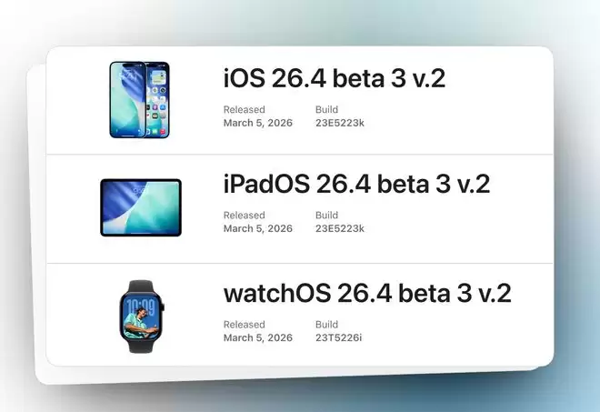 今天(3月6日)凌晨,苹果向参与测试的设备推送了iOS 26.4 Beta 3 v.2更新。这是继周二发布Beta 3之后,苹果在短时间内推出的又一个测试版本。同步获得更新的还包括iPadOS与watchOS 26.4 Beta 3 v.2。