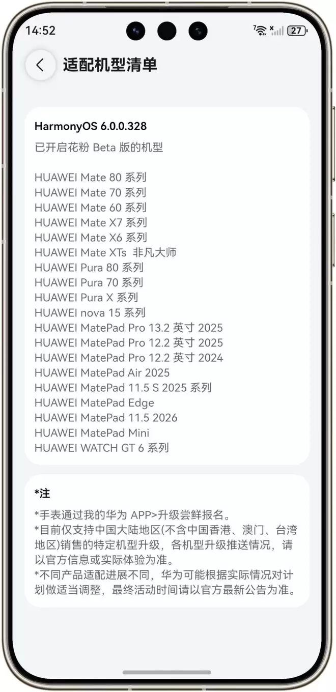 3月6日华为面向Mate 60系列、Pura 70系列、nova 15系列以及多款MatePad平板,正式开启了HarmonyOS 6.0.0.328花粉Beta版的尝鲜推送。