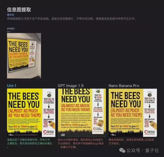 Uni-1准确还原了完整的海报布局、所有文字、正确配色,以及黑色草地剪影和正确的纵横比。GPT Image 1.5部分文字颜色错误,底部文字全部缺失,野花种子和蜜蜂的logo也出了问题。Nano Banana Pro整体布局尚可,但底部文字同样缺失。
