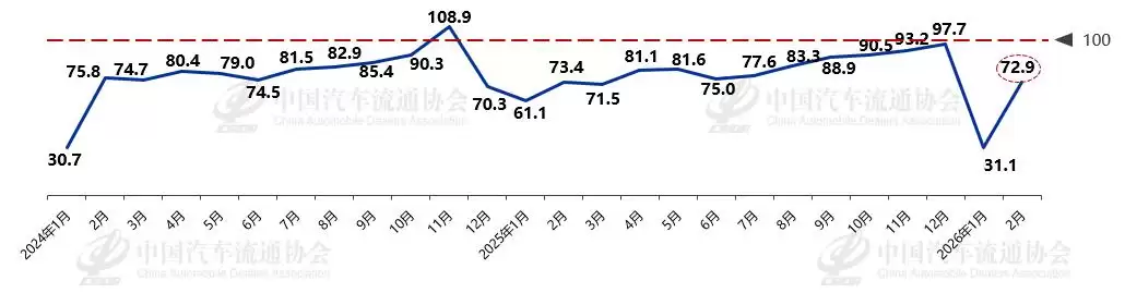 “向新”不仅是跃升的产值,更是消费者实实在在的购买力。中国汽车流通协会发布的2月汽车消费指数升至72.9,较1月明显上升,预示车市正从春节淡季的谷底稳步修复。