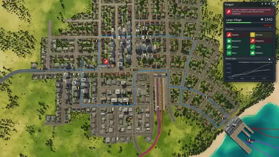 然而凡事皆有代价,扩张往往伴随着大麻烦。城市的声誉与市民满意度,将直接决定发展的快慢。大兴土木拆除建筑、砍伐森林等破坏环境的行为,会严重拉低当地口碑。不仅如此,过长的候车时间、低效的线路、物流延误、严重拥堵、噪音以及环境污染……这些负面因素若被无视,都会拖慢城市的发展脚步。好在玩家可以灵活运用隔音屏障、绿化林荫道等丰富工具,来化解这些城市病。