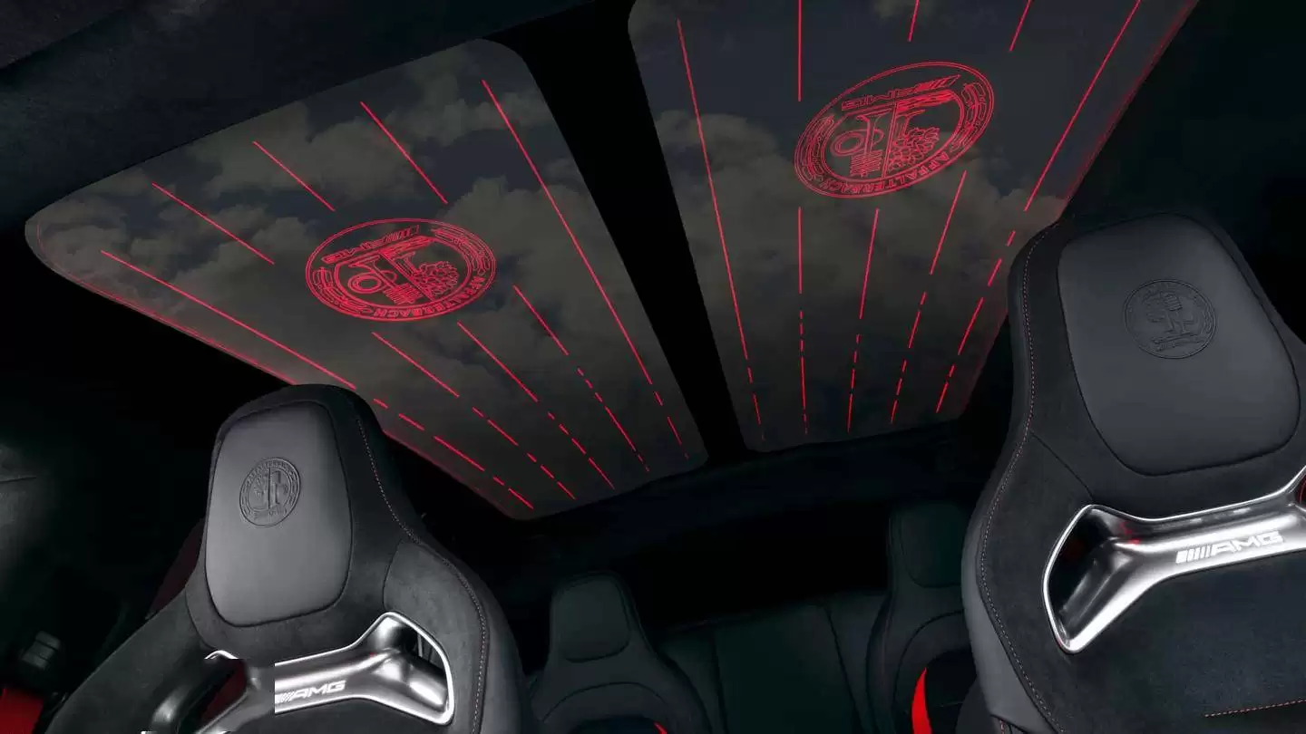 座舱氛围营造延续AMG标志性元素,头枕刺绣徽章与玻璃车顶的巨型发光LOGO形成呼应。车顶采用分段式调光技术,可局部调节透光率,配合点亮的气门弹簧、凸轮轴等机械图案,在夜间营造出独特的工程美学。后排座椅支持4/2/4比例放倒,四座版本通过独立座椅强化包裹性,五座版本则更注重实用性。