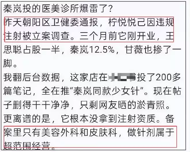1月份,有爆料称王思聪和秦岚合伙的医美公司暴雷了,因违规注射被卫健委立案调查。根据该公司备案信息可查,只有基本生活服务及美容服务,不具备医疗资格,针剂不在范围内。然而搜索该公司的宣传,不难发现大量集中在美容针方面,数量达到200篇,还拿秦岚当宣传,如今相关内容已删光。