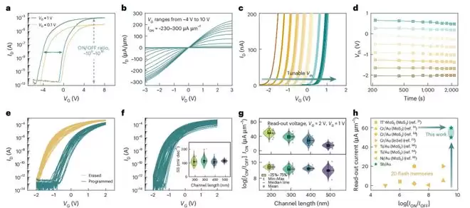 结果就是,单个闪存单元的开态电流能够达到 60 微安每微米,开关比超过 10 的 9 次方,这组数字在同类二维材料闪存里是最高的。