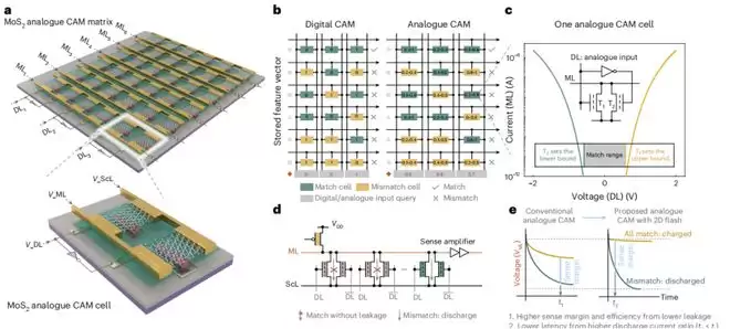 该芯片由二硫化钼这种比发丝还细几万倍的二维材料打造而来。芯片里集成了 256 个闪存单元,组成一个 8×16 的阵列。当你输入一个查询值,所有存储单元同时开始比对。而且,该模拟芯片单元存储的不是数字计算机上的 0 和 1,而是我们直接感知世界的连续模拟值。