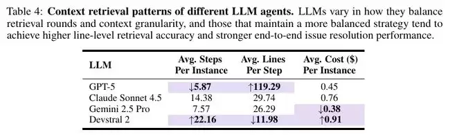 GPT-5 倾向于「少次多量」,平均只需 5.87 轮检索,但每一步会阅读高达 119 行代码,试图一次性获取大量信息 。