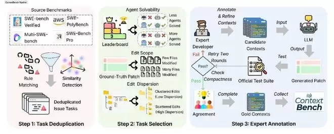 ContextBench并非直接构造新的编程任务,而是从真实开源仓库的 Issue 与补丁出发,逆向追踪问题修复过程中实际依赖的代码片段,并将其组织为评测用的「黄金上下文」。评测的核心由「是否修复成功」转变为「是否定位到正确代码」