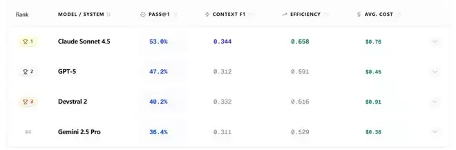 研究团队使用CONTEXTBENCH评测了当前最强的4款LLM和5种主流代码Agent框架: