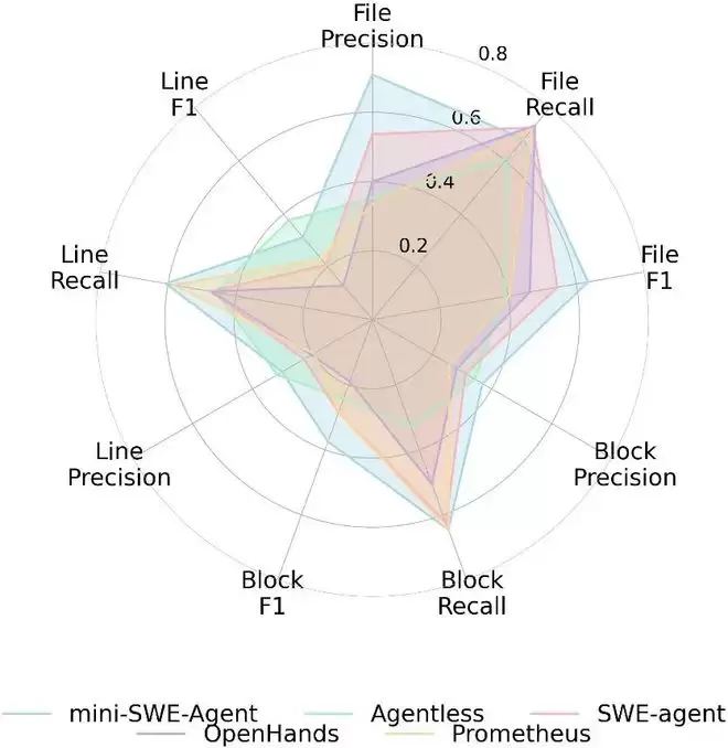 细粒度追踪:评测框架能够记录Agent的每一步操作轨迹,并在文件(File)、代码块(Block)、行(Line)三个层级上计算检索的精确率(Precision)和召回率(Recall)。这意味着模型的行为可以被量化为「定位能力」:不仅判断是否访问了关键文件,还能判断是否精确定位到关键函数乃至关键语句。