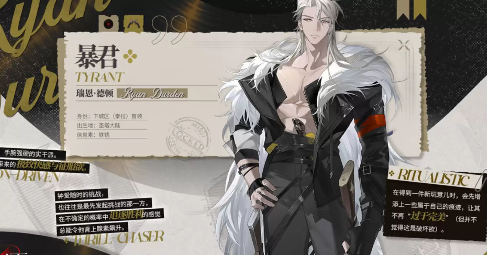 暴君的形象给人一种被压迫的感觉。他长相粗犷魁梧,一登场就带来强烈的视觉冲击。他的白发在昏暗背景下如同夜空中闪烁的星辰般耀眼。因为独特的长相,暴君身上多了一层神秘感,让人忍不住想去探寻他的身世与经历。他的气场强大到让人心生敬畏,仿佛整个世界都由他掌控与支配。当暴君现身时,周围的空气仿佛变得凝重,整个空间似乎都受他支配,带来一种无形的压力。